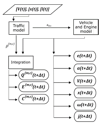The traffic model receives the inputs from the engine and vehicle models and calculates two important factors in every time step: the speed of every vehicle