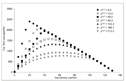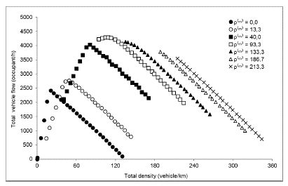 Figure 4 displays the total vehicle flow (Equation 8) as a function of the total density. When traffic is seen from this point of view, a higher density of motorcycles increases the total flow of vehicles up to 93,3 motorcycles/km. Figure 3 indicates that motorcycles can increase the passenger flow as high as 78% per lane, from 2 404 (cars only) to 4291 vehicles per hour (cars and motorcycles).