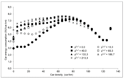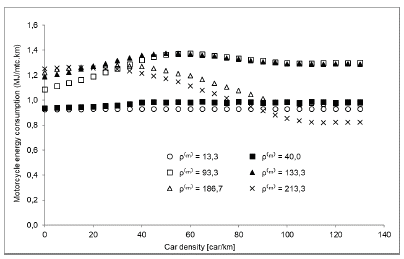 Figure 6 presents the results of energy consumption for motorcycles. For lower motorcycle densities (p(m) = 13,3 and p(m) = 40,0), consumption is not affected by cars or other motorcycles in the track. For medium and higher motorcycle densities, consumption qualitatively follows the reacceleration frequency.