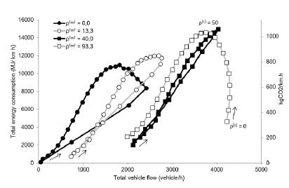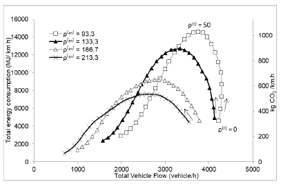 While examining the total energy consumption (Figures 7 and 8), some trends can be noticed. First, for the same total flow, it is better to have a higher proportion of motorcycles, since motorcycles are more fuel-economic than cars. Second, in the region of higher total flow (p(m) = 93,3, 0 < p(c) < 50), increasing car density can triplicate the energy consumption (consequently, CO2 emission) with insignificant benefit to the total vehicle flow. Another effect that is worth to discuss, it that for p(m) < 93,3 (Figure 7), an increase in car density tends first to increase the total flow up to its maximum value. On the other hand, for densities p(m) > 93,3 (Figure 8) an increase in the number of cars always decreases the total flow for the same motorcycle density.