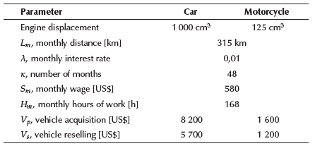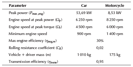 Table 1 lists the parameters employed in this study to represent cars and motorcycles, reproducing characteristics of the usual Brazilian models. In average, Brazilian cars are lighter and less powerful than American and European cars.