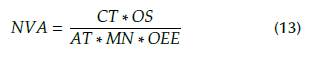 Figure 5 shows the DFVSM design, where process and material flows are displayed. In the final part of the Figure, the timeline that determines the lead time of the product order is observed. AV activities are only the cycle times, and NVA activities are related to waiting times for SST and CST, as well as waiting times in each operation. The parameters used for its determination are, cycle time (CT), order size (OS), available time (AT), machine number (MN), and OEE. They were determined with the following function: