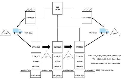 In the second stage, current VSM of the cutting process in a textile company was developed using six deterministic parameters, which validated the conceptualization of the problem of establishing a deterministic planning that will contrast with the stochastic execution of daily activities in each of the operations of the process. In the lean manufacturing approach, the cycle times of each operation are the only AV activities. To determine the NVA activities in each operation, the parameters involved are the size of the order, the available time, the percentage of efficiency and effectiveness, and the number of machines.