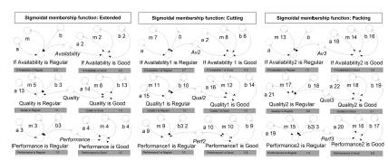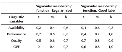Table 1 shows the ranges of the sigmoidal membership function for the linguistic labels (regular and good) by the three input variables (availability, performance, quality) and one output variable (OEE). Figure 3 shows the development of the fuzzification stage, using only auxiliary variables in the dynamic model. The parameters for each linguistic label a, m, and b were determined for the regular and good labels. The linguistic input variables consider each of the 3 processes of the manufacturing system, and their values can be seen in the indicators.