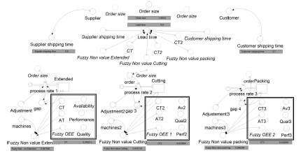 For each operation, a balancing loop was developed to fulfill the specific goal or order size. The contribution of this dynamic model is the integration of a fuzzy system for the OEE% variable, since the evaluation of the availability, quality, and performance attributes are subjective and imprecise, and an uncertainty approach is also integrated into the model when using normal distribution functions for variables such as cycle time, available time, supplier time, and delivery time. A fuzzy system was developed for each operation of the textile cutting process. Parameters for the sigmoidal membership function were defined through auxiliary variables. Eight fuzzy rules were defined. The stage of implication and aggregation was performed through a maximum fuzzy operator. In this way, it contributes to the modelling of systems dynamics for variables that are imprecise or qualitative variables for any case.