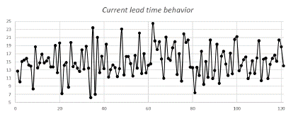 120 simulations were performed to be able to explain the process behavior of an order size of 1800 products. The lead time oscillated between 6 and 24 days. The expected lead time after 120 runs was 15,05 days (Figure 6).