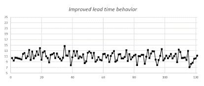 Figure 7 shows the behavior of 120 runs with improved times, significantly reducing by 28% the estimate of the expected delivery time to the end customer and significantly reducing the dispersion of results.