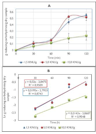 Alternatively, it is important to characterize the reaction kinetics for a reducing sugar gain. Contents of RC increase as part of the aging process, as shown in Figure 3A. First-order kinetics correctly described an increase in reducing sugars (R2 > 0,95, 1,5 KNU/g in Equation (1)), as shown Figure 3B.