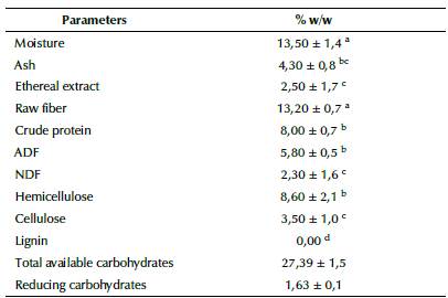 The contents of moisture (method 925.10), crude protein (method 955.04), ether extract (method 963.15), crude fiber (method 962.09), and ash (method 941.12) were determined for each residue by means of the official methodology (AOAC, 2000). Also, neutral detergent fiber (NDF), acid detergent fiber (ADF), cellulose, hemicellulose, and lignin were all quantified according to the Van Soest methodologies (P. Van Soest and Wine, 1968; P. J. Van Soest, 1963).