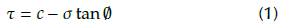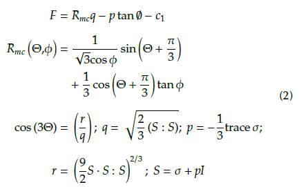 Therefore, the Mohr-Coulomb model is defined by Equation (1), where a is negative in compression, from the average of the maximum and minimum Mohr's circle; c is the cohesion; ø the friction angle; σ m the principal stresses; and S is half the difference between the maximum and minimum principal stresses.