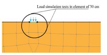 The geometry of the foundation soil was defined considering the stratification and, after simulating the initial stress, the load of the 3 m high embankment was added. Later stages of implementation regarding the loading and unloading for each of the pressures determined in the test and the application time of the load were defined. For the simulation, the test area with 30 cm elements was zoned to represent the circular plate of 300 mm in diameter and a distributed load on the element equal to the test value (Figure 9).