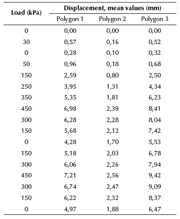 The most representative results from the plate-load tests are shown in Figure 3. The mean value of the most representative tests of the polygons is presented in Table 4. It can be observed that the data of polygon number 2 are not representative of the entire set, which is why this polygon has not been used in the calibration process.