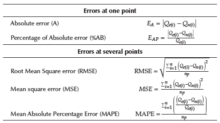 Table 5 shows two expressions used for errors at one point and, three expressions used for several points. All expressions depend on the results of the control pattern (Qe(i)), that is, the results obtained from the experimental test and the results from the numerical model (Qn(i)).