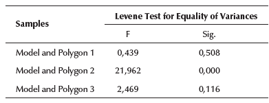 On the other hand, the Levene test was applied with the null hypothesis that the population variances are equal. As is shown in Table 8, the P-value was higher than 0,05 when the model was compared with polygons 1 and 3, thus corroborating the similarities in variances. The P-value of polygon 2 was less than 0,05, thus corroborating that those experiments were not representative.