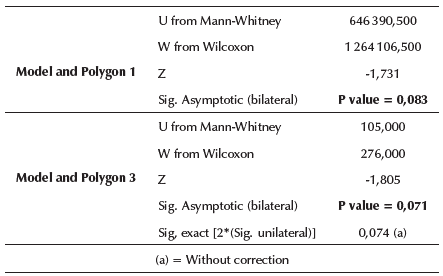 However, this paper presents another way to calibrate the numerical model through the determination of similarities between two independent samples by means of statistical hypotheses. Table 7 shows the K-S test for polygons and the model, where no data fits the normal distribution, since the P-value was less than 0,05.