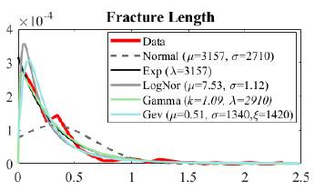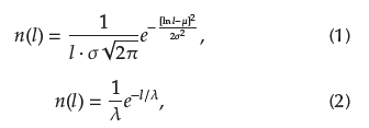 where μ is the log-mean, σ is the log-standard-deviation, λ is a parameter of the exponential distribution, l is the fracture length, and n(l) is the frequency distribution of fracture lengths.