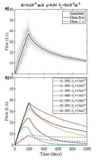 Figure 5b displays the calculated QDFN for different fracture densities in settings S1 and S6, and QEPM, showing how flow increases as the number of fractures does. The excavation phase shows a good fit between EPM and DFN (until 200 days). However, the tail of the hydrograph is overestimated by the EPM approach, which leads us to perform a sensitivity analysis of the Ss for S1, showing how the peak and the recession flow decrease as a function of Ss.