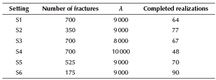 In this case, the behavior of the hydrographs was analyzed by varying the fracture length, aperture, and density distributions. Six settings were built (each one with 100 realizations). The fracture length frequency was assumed tofollowa log-normal distribution with μ= -4,5 m and σ = 3,4 m, whereas the exponential distribution was used for the fracture apertures. The fracture density or number of fractures was randomly assigned. Settings S1, S3, and S4 have the same density but their exponent λ varies from 8 000 to 10 000, while, in settings S2, S5, and S6 the exponent λ is kept constant (it is equal to 9 000). The parameters for each setting are displayed in Table 1.