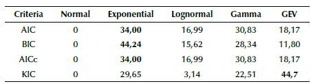Finding the best statistical distribution governing a dataset is of critical importance when predicting the tendency of fracture attributes (Rizzo et al., 2017). The information criterion approach is implemented using the Akaike Information Criterion AIC (Akaike, 1974), the corrected AICc (Cavanaugh, 1997), the Bayesian Information Criteria BIC (Schwarz, 1978), and the KIC (Kashyap, 1982). Then, the estimation of the posterior model weight (for AIC and AlCc) or posterior model probability (for BIC and KIC) is implemented, as described in detail by Ye et al. (2008) and Siena et al. (2017). Fracture length was fitted to five probability density functions (normal, exponential, lognormal, gamma, and General Extreme Value-GEV) using the Maximum Likelihood Estimator approach. The four information criteria indicate the best fit for the exponential distribution with the lowest values. The same result is obtained by the posterior model weight or posterior model probability (showing the higher values) using the AIC, AlCc, and BIC (Table 2). However, the KIC posterior probability is better for the GEV distribution, as it discriminates the models on the quality of the model parameter estimates (Siena et al., 2017). Therefore, the exponential distribution is selected for the DFN generations of the Alaska fault zone with λ = 3,16 x 103 m. The data fit is shown in Figure 3.