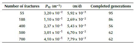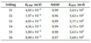 Table 3 contains KEPM , NASH, and KDFN for each setting. KEPM varies between 8 x 10-3 and 4 x 10-2 m/d, while KDFN ranges from 5 x 102 to 6 x 102 m/d. The difference between both approaches (KEPM and KDFN) exceeds 5 orders of magnitude. Therefore, the values are not comparable, and the assumption of an equivalent permeability of the media, estimated as KDFN and proposed by de Dreuzy et al. (2001b), does not work in this study. It may be associated to the matrix of low permeability and P32 below 1 used in this research. Consequently, the effects of matrix permeability and fracture density should be taken into account for future modeling and analysis.