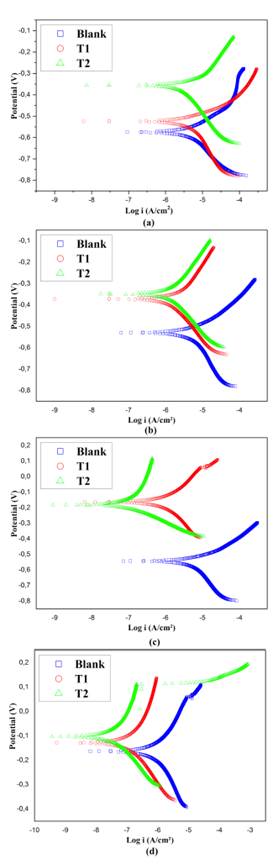 Extrapolation Tafel: In order to obtain information concerning the corrosion resistance of AISI 420 SS, the quantitative assessment of corrosion was conducted by potentiodynamic polarization tests. Figure 2 illustrates the comparison of the potentiodynamic polarization curves between implanted and non-implanted samples exposed to NaCl (wt. 3%) solution at different exposition times. The relevant parameters are listed in Table 3.