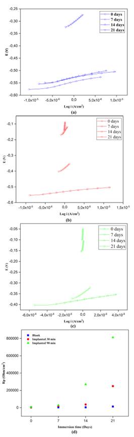 The relation between the potential and the current density of non-implanted samples is depicted in Figure 3a. The typical trend of polarization curves was observed, with a relatively similar RP values at 0 days (3 364,2 Ω.cm2), 7 days (3 632,8 Ω.cm2), and 14 days (3 937,6 Ω.cm2). It then reached the highest value at 21 days (12 810,0 Ω.cm2) of exposition due to a possible passivation of the metallic surface by the formation of a chrome oxide film, a natural characteristic of martensitic SS against corrosion. As for the results in the current-potential profile of implanted samples, a remarkable difference between the RP values was observed; there was a gradual magnitude increase during the immersion time in the saline solution. In the case of the substrates implanted with nitrogen for 30 minutes in Figure 3b, the RP values were 2 812,1 Ω.cm2, 19 562,0 Ω.cm2, and 36 455,0 Ω.cm2 at 0, 7, and 14 days, respectively. At 21 days, where the RP reached the highest magnitude or polarization resistance (248 905,0 Ω.cm2), the curve presented a vertical trend of quasi-steady current as the potential increased, which indicates the formation of a passive film upon the surface. Similarly, the samples implanted with nitrogen for 90 minutes (Figure 3c) exhibited such tendency, where the RP values at 0 and 7 days were 6 553,3 Ω.cm2 and 28 030,0 Ω.cm2, respectively. However, this system achieved the passive behavior at 14 days with an RP of 269 228,0 Ω.cm2, and then at 21 days with the highest polarization resistance at 812 510,0 Ω.cm2. An overall RP behavior of the samples is shown in Figure 3d.