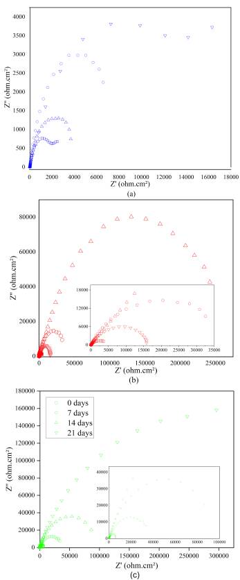 In Figure 4, the Nyquist plots are illustrated from EIS measurements carried out at different exposition times for both non-implanted (Figure 4a) and implanted samples with nitrogen species at different treatment times (Figure 4b and c). All the Nyquist plots end up with an unfinished semicircular form. A similar electrochemical tendency can be seen in the implanted samples, where the influence of 3DII with nitrogen particles is made evident by comparing the radius of the curves with those described by the blanks. The difference lies in the shifting of the curves for the implanted samples along the real axis, which is due to the series resistances comprising electrolytes and contact resistance. This can be validated from the values obtained in Table 4. Since high RP values suggest a good corrosion resistance, and low capacitance magnitudes signify the long-term stability of the passive film, the geometric increment in the curve amplitudes is attributed to a direct increase between the polarization resistances of each system with both the exposition time and treatment time in the implantation process. The RP increased from 990,0 Ω.cm2 (0 days) to 22 516,0 Ω.cm2 (21 days) in blanks (Figure 4a), from 842,7 Ω.cm2 (0 days) to 26 000,0 Q.cm2 (21 days) in samples implanted for 30 minutes (Figure 4b), and from 5 557,0 Ω.cm2 (0 days) to 463 780,0 Ω.cm2 (21 days) in samples implanted for 90 minutes (Figure 4c).
