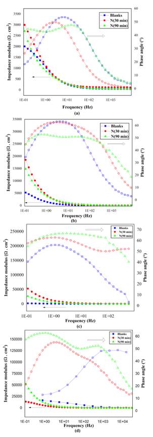 Figure 5 shows the Bode diagram representation of EIS measurements for blanks and nitrogen implanted on AISI 420 SS samples after immersion in the same corrosive medium. An ideal capacitive response would result in a (-1) slope and a phase angle of 90°. Although no electrochemical system behaves in such an ideal manner, it is possible to identify the expected capacitive behavior of passive films exposed to electrochemical attack in non-implanted samples, a consequence commonly attributed to the characteristic chromium oxide film AISI 420 SS (Hannani and Kermiche, 1998).