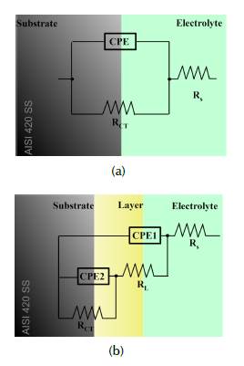 Equivalent circuit: Each system was characterized by using an appropriate equivalent circuit model. The circuit depicted in Figure 6a represents the samples without treatment and can be considered as a simple Randle's cell with only one electroactive interface. The electrical circuit in Figure 6b with two electroactive interfaces is widely used in studies on ion selective membranes (or coated electrode-electrolyte interfaces) when examining metallic corrosion under coatings exposed to corrosive environments (Olaya et al., 2011; Piratoba et al., 2010; Abdi and Savaloni, 2017; Jimenez-Morales et al., 1997).