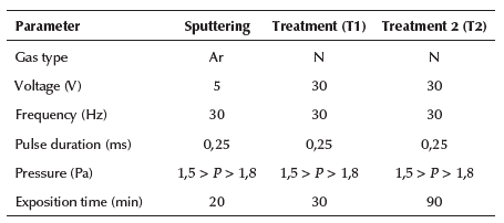 3DII is performed by means of the Joint Universal Plasma and Ion TEchnology Reactor (JUPITER), a prototype of this technique. The process is based on a high voltage pulsed discharge activated within the low-pressure range or 'high vacuum'. For a more detailed description of the properties, phenomena, and other generalities occurred in this type of plasma-ion technology, a review of the referenced literature is encouraged (Parada et al., 2019; Vladimir and Tsygankov, 1997). Once the samples are placed upon the cathode (the region where the applied voltage drops) inside the vacuum chamber of the reactor, a pump system is set up to achieve the required vacuum operations and then ignite the discharge. At this pressure conditions, an ion flux of gaseous nitrogen is fed into the chamber. Once exposed to the applied potential (whose magnitude is of an order from tenths to hundredths of kiloelectronvolts), the gas particles reach an ionization state and then, due to the auto-sustained plasma, which is generated by the effect of this type of discharge at such conditions, the excited particles are attracted towards the cathode, also granting the implantation of ionized species upon the surface of the substrates at a normal angle on the surface. Additionally, prior to the implantation process in this study, there was additional surface preparation by sputtering. That is, before feeding in the ion flux of nitrogen, an Argon (Ar) flux was supplied at certain conditions with the purpose of eliminating the greatest possible amount of impurities and adapting the roughness across the surface of the substrates. The JUPITER operation conditions for both processes (sputtering and ion implantation) agree with previous experiments and shown in Table 2 (Dougar-Zhabon et al., 1999, 2002; Valbuena-Nino et al., 2010, 2011, 2020; Sanabria et al., 2019, 2020).