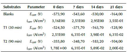 Corrosion current density (icorr) was estimated by means of linear fit and Tafel extrapolation to the cathodic part of the polarization curve. From Table 3, it can be observed that the corrosion current density (icorr) is inversely proportional to the corrosion potential (Ecorr), which implies the same pattern of corrosion behavior, that is, an increase in icorr implies a degradation of the protective properties of the passive film formed during the implantation process. As mentioned before, the reaction rate in samples without treatment remained the highest throughout the exposition time in saline solutions. Conversely, it can be observed that the Ecorr and icorr of the implanted samples provided better results compared to non-implanted samples. Since the icorr magnitudes reflect the rate of dissolution through the passive layer, it can be concluded that the samples implanted with nitrogen for 30 minutes possess a better corrosion resistance in comparison with the blanks. Thus, it can be said that the treatment with the same ion implanted for 90 minutes exhibits the highest corrosion resistance. As for the inspection at 14 days of chemical attack, the samples implanted for 90 minutes showed an increase in Ecorr accompanied by lower icorr than those implanted for 30 minutes, which confirms a more important improvement in the corrosion resistance of AISI implanted with nitrogen under these conditions. Finally, it is worth mentioning the existence of a transpassive region, where the rapid increase in the current value occurs due to a breakdown of the passive films. This tendency is commonly known as pitting corrosion, and it is made evident in Figure 2c for the samples implanted for 30 minutes at a potential of 0,06 V. A more notable tendency of this phenomena is presented in Figure 2d for blanks and samples implanted for 90 minutes at potentials of 0,06 V and 0,12 V, respectively. (Anandan et al., 2007; Maleki-Ghaleh etal., 2014; Muthukumaran etal., 2010; Padhy et al., 2010; Pereira et al., 2017; Osozawa and Okato, 1976).