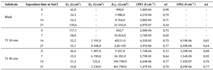 Conversely, the double layer capacitance for each system globally presented a reduction in its magnitude throughout the electrochemical exposition from 9,38E-03 F.cm-2 to 9,70E-06 F.cm-2 in blanks (Figure 4a); from 2,64E-3 F.cm-2 to 6,59E- 06 F.cm-2 in samples implanted for 30 minutes (Figure 4); and from 3,39E-04 F.cm-2 to 8,59E-06 F.cm-2 in samples implanted for 90 minutes (Figure 4c). The increase observed in the RP values in implanted samples is due to stable and readily passive film formation owing to the interfacial nitrogen and the production of chromium nitride. The similar tendency observed in bare substrates, although at a lower degree, may be attributed to the passive nature of martensitic AISI 420 SS in chloride media. As for the capacitance decrease, it indicates an improvement in the passive film stability, thus validating the positive effect on samples implanted with nitrogen (Leitao etal., 1997; Hannani, and Kermiche, 1998).