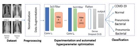 In this study, new models for detecting COVID-19 and other pneumonia cases using CNNs and X-ray images are presented. Figure 2 shows the general method used to obtain the proposed models. In general, the method consists of the following phases: consolidating the data set, preprocessing (which includes normalization and image augmentation), and experimentation and automated hyperparameter optimization.