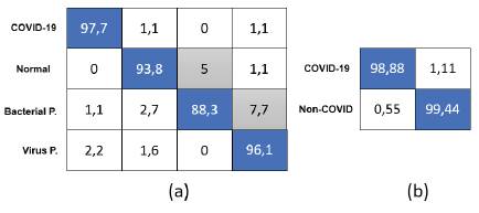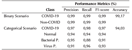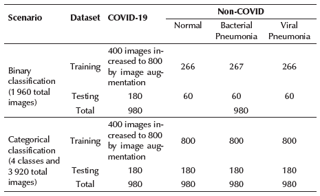 For this reason, the binary classification scenario analyzed a total of 1 960 images, 980 belonging to the COVID-19 class and 980 belonging to the Non-COVID-19 (Normal/Bacterial Pneumonia/Viral Pneumonia) class. Finally, the categorical scenario (4 classes) analyzed a total of 3 829 images, 980 for each category involved.