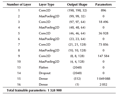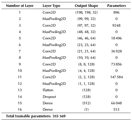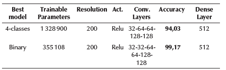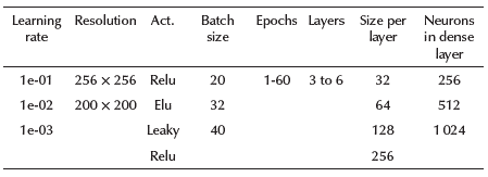According to Mahmud et al. (2020), models that analyze COVID-19 images with a 256 X 256 resolution yield good results. Therefore, imaging was carried out in 256 X 256 and 200 X 200 resolutions (this second resolution reduces the number of trainable parameters in the models). Both of these allowed a maximum of 6 convolutional layers, so 3, 4, 5 and 6 layers were tested during 60 epochs, analyzing the accuracy, network capacity (total trainable parameters), and overfit. The tested activation functions were relu, elu, and leaky relu. The depth of the feature maps was progressively increased in the network (from 32 to 256), whereas the size of the feature maps decreased (for instance, from 198 X 198 to 1 X 1 when a 200 X 200 resolution was used). Table 2 shows a summary of the different choices tested for each hyperparameter, and Table 3 shows the best models, their accuracy, number of trainable parameters, and their selected hyperparameters after experimentation. The models were validated through cross-validation, confusion matrix and precision, recall, and F1-score values.