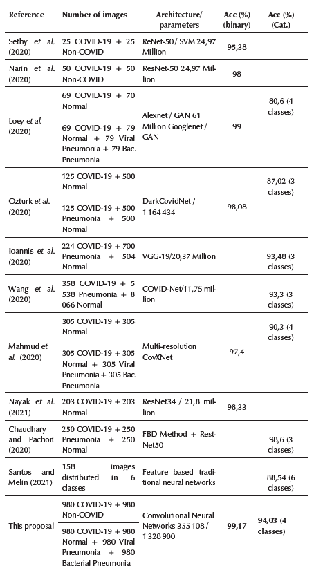 Most of the previous studies have only used between 25 and 224 COVID-19 images, for analyzing just 2 or 3 categories. Furthermore, the hyperparameter optimization process is not performed in an exhaustive and automated way as this research does. Additionally, only Mahmud et al. (2020), Loey et al. (2020), and Santos and Melin (2021) analyzed 4 categories, obtaining an accuracy of 90,3, 80,6, and 88,54%, respectively, which can be clearly improved. In this research, 980 COVID-19 images were used (580 increased to 980 by image augmentation to avoid the unbalanced data problem) and a total of 1 960 and 3 920 images for each classification scenario, respectively, which is a significantly higher number of images. Furthermore, the network capacity for the binary scenario was adjusted to only 353 569 parameters, while the accuracy was increased to 99,17%, and, for the categorical scenario (4 classes involved), the network capacity was adjusted to only 1 328 900 parameters, while the accuracy was increased to 94,01%.