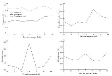 The experiment was performed in a didactic and experimental area at the Federal University of Pelotas (UFPel), Department of Phytotechnics, PPG in Seed Science and Technology (31 ° 52 'S; 52 ° 21' W). The data of maximum and minimum temperature (°C), solar radiation (cal cm-2 day-1), rainfall (mm), and relative humidity (%) were obtained from a climate report from the Pelotas agroclimatological station (Figure 1), located near an UFPel campus.