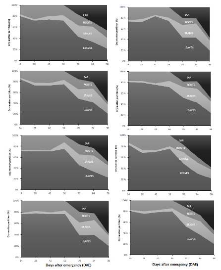 The dry matter partition between the different organs was determined from the total dry mass allocated in each structure in relation to the total dry matter, and the results were expressed in percentage.