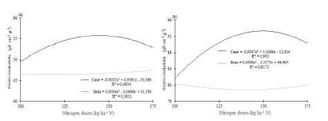 The highest doses of nitrogen available in the soil did not have a direct relation to the maximum rate of dry matter production but obtained a temporal difference for cultivar BRS Brau. Cultivar BRS Cauê also presented variation according to the dose used. Thus, the adequate amount of nitrogen available to the plants could provide greater assimilation and conversion of this mineral into amino acids and proteins, which are related to the growth and development of the crop (Malavolta, 2006), that is, according to the capacity of the cultivar used.