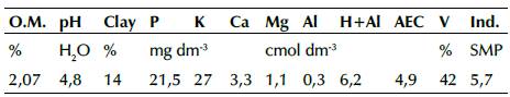 Soil correction was performed according to the requirements determined in the soil analysis (Table 1), as well as the recommendations of the fertilization and liming manual of the states of Rio Grande do Sul and Santa Catarina (CQFS, 2016) for a productivity of four tons per ha.