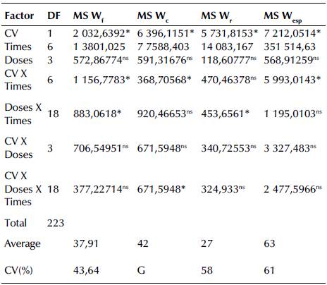 The 150 kg ha-1 N dose resulted in a superiority of total dry matter over time (Wt) for both evaluated cultivars.