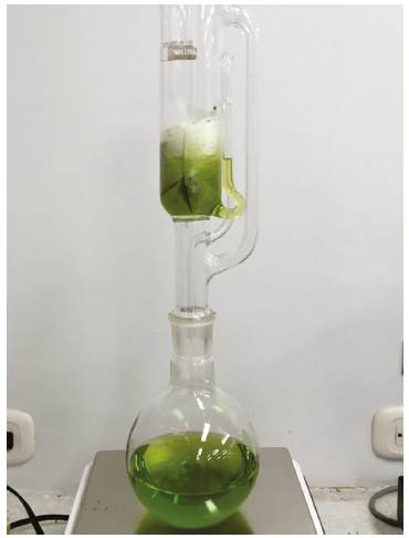 One way to evaluate the quantity of soluble compounds that are present in the solid and that can be extracted by means of the lixiviation is Soxhlet extraction. This procedure uses a device that allows the vapors of the boiling solvent in a container to ascend in a lateral arm and condense in such a way that they fall on a quantity of solid contained in a permeable cartridge, which is usually made of cellulose. When a sufficient volume of condensate is reached while in contact with the solid, and due to the siphoning effect, the lixiviate returns to the solvent container (which is now the lixiviate container) through another lateral detachment, and a new cycle begins (Figure 1).