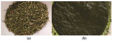 To extract compounds from the biomass of Cannabis sativa in Colombian crops, a ground mixture of stems, leaves., seeds, and some flower fragments was obtained, which was provided by the Finca Interacviva company, with potency of 3,24%. This biomass comes from the Colombian department of Cauca, and it was chosen for the ease of obtaining it and because there are many cannabis crops in the region (Figure 2a).