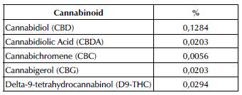 In the extract (FS9 in period 11) obtained through the proposed process, cannabinoids were identified and quantified, as they are compounds with high added value and with which comparisons can be established with other varieties of cannabis. High Performance Liquid Chromatography (HPLC), according to AOAC-SMPR, was used for this purpose.
