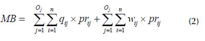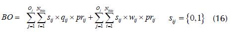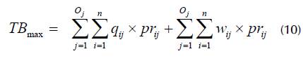 Table 1 shows that, given the availability of xi, and prioritizing only the highest prij according to bwij and bqij, the algorithm found the best billing mix, i.e., MB = 1 840,00, then, MB < TV (xi< Qi). For example, for "d", despite fdd200 < fdd250, the algorithm prioritized billing for O250, given that, prd250 > prd200 in POP. Note that the MB does not yet consider all the criteria and decision variables inherent to the OBS. Therefore, Total Billing (TB) maximization of the POP can be expressed as a mathematical programming model to maximize TBmax: 1. If x = 0, s.. = 0 according to Equation (11).