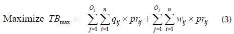 OBS optimization is subjected to the calculation of the possible Maximum Billing (MB) that can be obtained from the inventory of each SKU available in the DC versus the Q. of the POP at a given t moment of the VTW. The calculation of the MB is then used to check the need for execution and of an IGA-OBS/GA-OBS search parameter to optimize the OBS. In cases where the MB < TV, i.e. if xi< Qi, so the MB will be the main parameter of the best possible solution for the OBS. The calculation criterion to obtain the MB, as demonstrated by Equation (1), prioritizes the highest prij according to the following parameters: i) bwij. - billing value of wij and; ii) bqij - billing value of qij .
