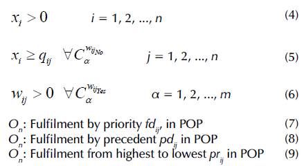 In the OBS, the SKU notation refers to the registration number that distinguishes the n product types available in the DC stock. The quantity of each SKU in stock at a given t moment of the VTW is given by x, and it is represented by the set X = {x1, x2, xn}, in which the subscript i = (1, 2 n) denotes the i-th SKU. The Purchase Order Portfolio (POP) comprises n orders, represented by POP = {O1, O2, On}, and the subscript j refers to the j-th order ∀j = (1, 2, n). These orders are from a set of m customers, represented by CG = {C1, C2, Cm}, in which the subscript a = (1, 2, m) denotes the a-th customer (Cα) of the POP. The total demand of x in the POP is given by Q, whereas the demand of xj in Oj is given by qij being Oj = {q1j q2j,…, qnj} ∀i = (1, 2 n) attributes of Cα . If TV is the Total Value of the POP at the t instant of billing in the VTW, then, the TV will only be obtained if xi ≥ Qi, in which y is the restriction of xi and wi = (Qi - yi ) is the availability of x in case y > 0. Thus, the notationcy-' determines that the customer accepts w billing to Oj , whereas cwα determines that the customer does not accept w billing to Oj.. The insertion date of q ij in the POP is denoted by id., and, subsequently, the pre-defined priority criteria for the OBS are obtained: i) fd - order fulfilment date of i in Oj ii) pd. - order payment date of i in Oj and; iii) pr.. - unit selling price of i in Oj. The entire billing process of is carried out by comparing Qi. to the offer of x, so that, every non-billed qij will be transferred to t+1 to be processed again by the next VTW. Up next are the indexes, parameters and restrictions, as well as the decision criteria and variables that configure the OBS optimization problem: