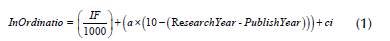 where IF is the impact factor, α is a weighting factor ranging from 1 to 10 to be attributed by the researcher; ResearchYear is the year in which the bibliographic research was developed; PublishYear is the year in which the selected paper was published; and Ci is the number of times the paper has been cited on Google Scholar (Pagani et al., 2015).