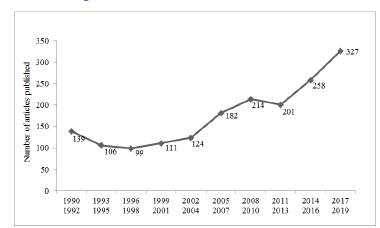 The period between 2017 and 2019 presented the largest number of articles published in journals: 327 articles, succeeding 2014-2016 with 258 articles, and 2008-2010 with 214 articles. In an interrupted period from 1927-1989, another 3 216 were indexed in the consulted databases, in addition to years prior to 1927, with records of 38 articles.