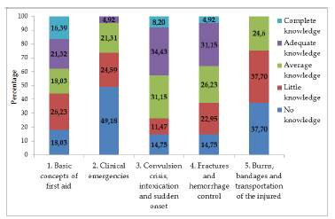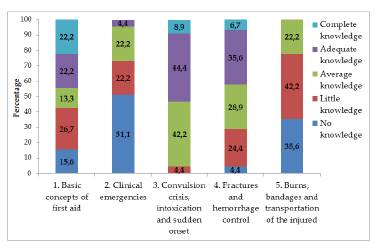 Figures 4 and 5 show that the initial assessment sought to ascertain the students' intrinsic knowledge about the subject, judging whether their answers adequately met the guidelines of the world protocol of prehospital care (PHTLS). The questionnaire also found that the students had the least knowledge about the modules involving clinical emergencies and burns, bandages, and transportation.